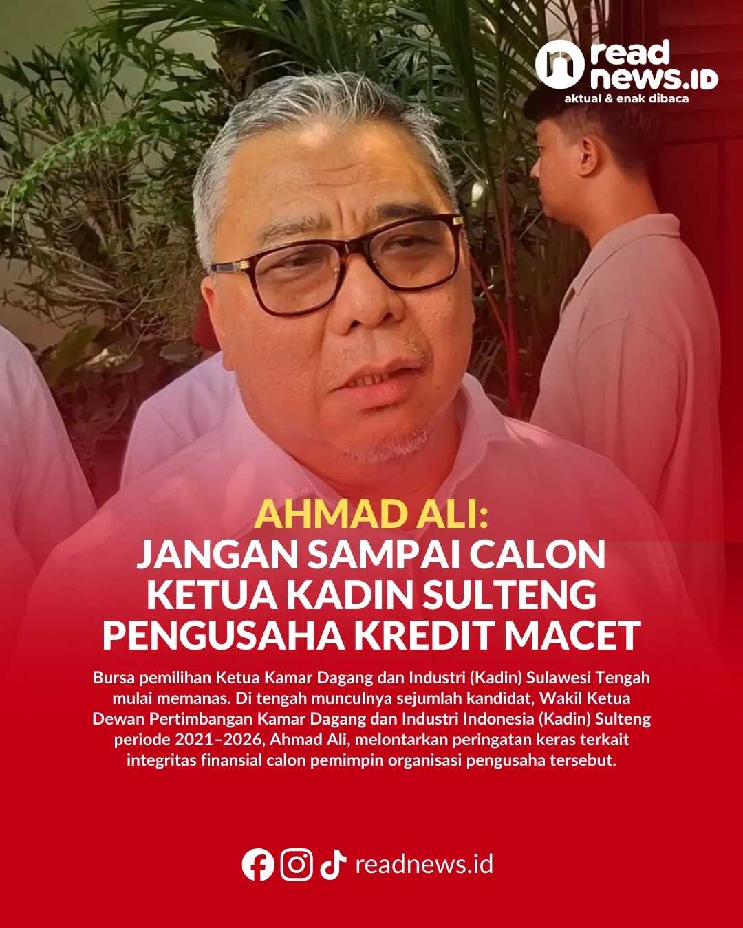 READNEWS.ID, PALU – Bursa pemilihan Ketua Kamar Dagang dan Industri (Kadin) Sulawesi Tengah mulai memanas. Di tengah munculnya sejumlah kandidat, Wakil Ketua Dewan Pertimbangan Kamar Dagang dan Industri Indonesia (Kadin) Sulteng periode 2021–2026, Ahmad Ali, melontarkan peringatan keras terkait integritas finansial calon pemimpin organisasi pengusaha tersebut.