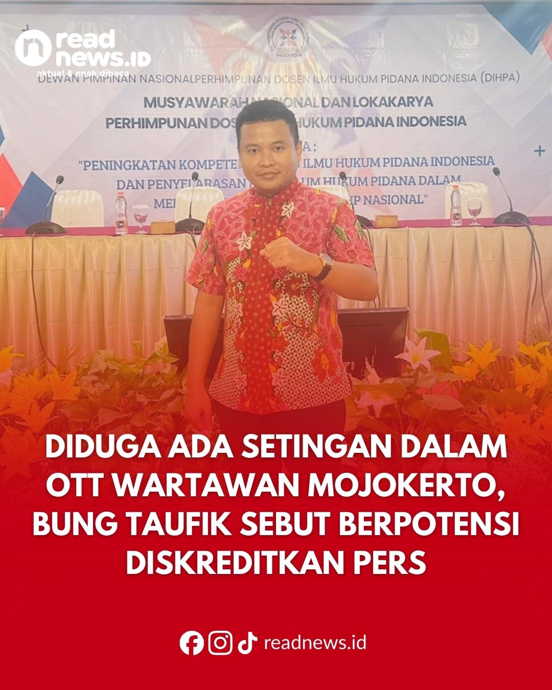 READNEWS.ID, SURABAYA – Advokat Jawa Timur, Bung Taufik, menyampaikan keprihatinan dan penyesalannya atas peristiwa dugaan operasi tangkap tangan (OTT) terhadap seorang wartawan yang terjadi di wilayah Mojokerto. Peristiwa tersebut disebut berkaitan dengan laporan dugaan pemerasan terhadap seorang pengacara, yang kemudian berujung pada penangkapan oleh aparat Polres Mojokerto.