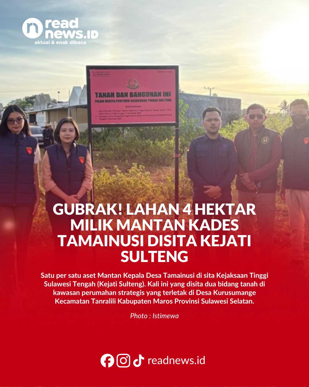 READNEWS.ID, PALU – Satu per satu aset Mantan Kepala Desa Tamainusi di sita Kejaksaan Tinggi Sulawesi Tengah (Kejati Sulteng). Kali ini yang disita dua bidang tanah di kawasan perumahan strategis yang terletak di Desa Kurusumange Kecamatan Tanralili Kabupaten Maros Provinsi Sulawesi Selatan.