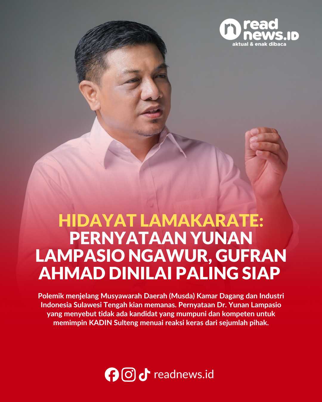 READNEWS.ID, PALU – Polemik menjelang Musyawarah Daerah (Musda) Kamar Dagang dan Industri Indonesia Sulawesi Tengah kian memanas. Pernyataan Dr. Yunan Lampasio yang menyebut tidak ada kandidat yang mumpuni dan kompeten untuk memimpin KADIN Sulteng menuai reaksi keras dari sejumlah pihak.