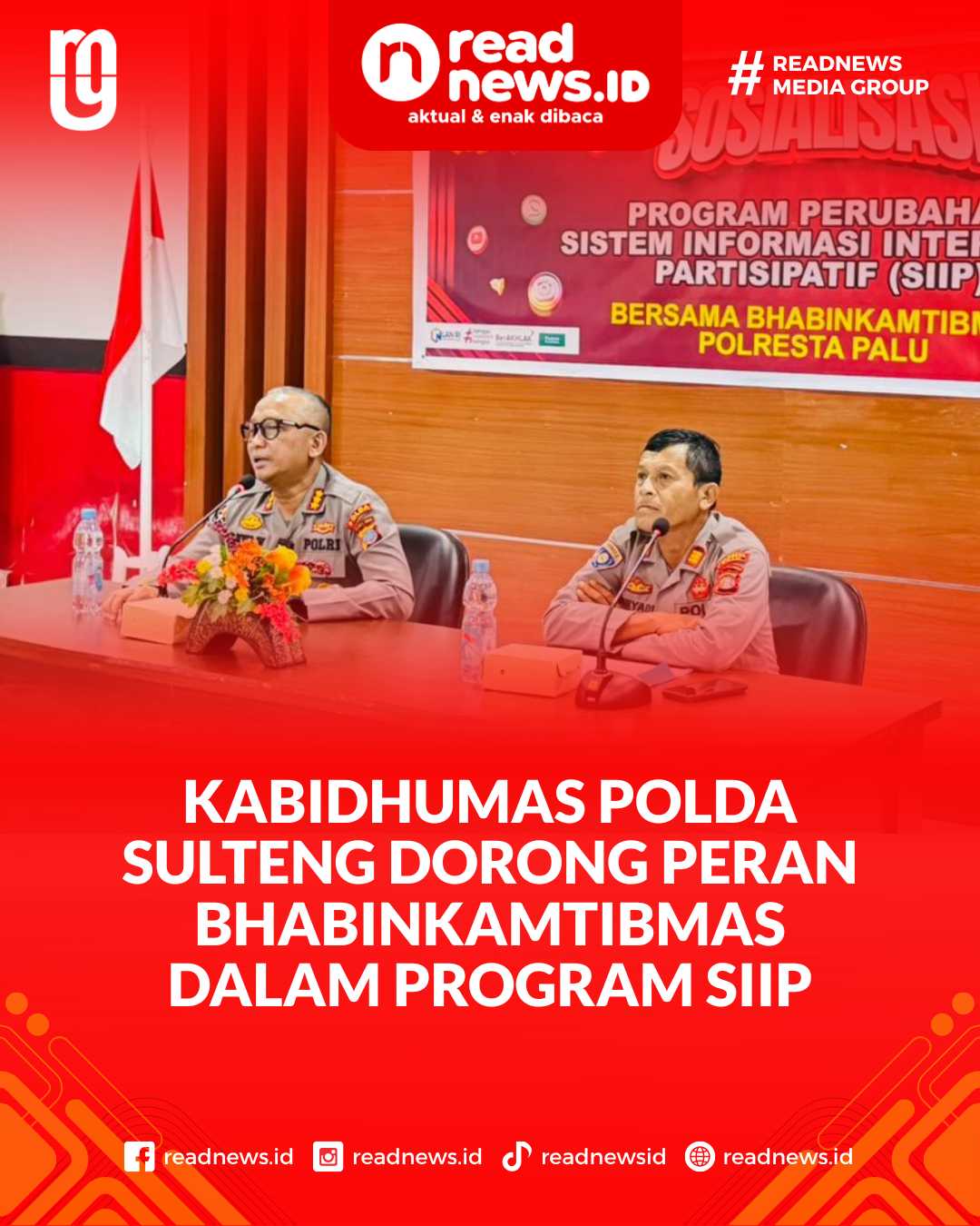 READNEWS.ID, PALU – Kabid Humas Polda Sulawesi Tengah (Sulteng), Kombes Pol Djoko Wienartono, S.I.K., S.H., menekankan pentingnya peran Bhabinkamtibmas dalam penerapan Program Perubahan Sistem Informasi Interaktif Partisipatif (SIIP). Penekanan ini disampaikan dalam sosialisasi program yang berlangsung di Aula Rupatama Polresta Palu, Rabu (8/10/2025).