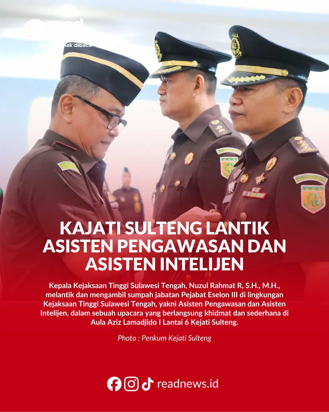 READNEWS.ID, PALU – Kepala Kejaksaan Tinggi Sulawesi Tengah, Nuzul Rahmat R, S.H., M.H., melantik dan mengambil sumpah jabatan Pejabat Eselon III di lingkungan Kejaksaan Tinggi Sulawesi Tengah, yakni Asisten Pengawasan dan Asisten Intelijen, dalam sebuah upacara yang berlangsung khidmat dan sederhana di Aula Aziz Lamadjido I Lantai 6 Kejati Sulteng.