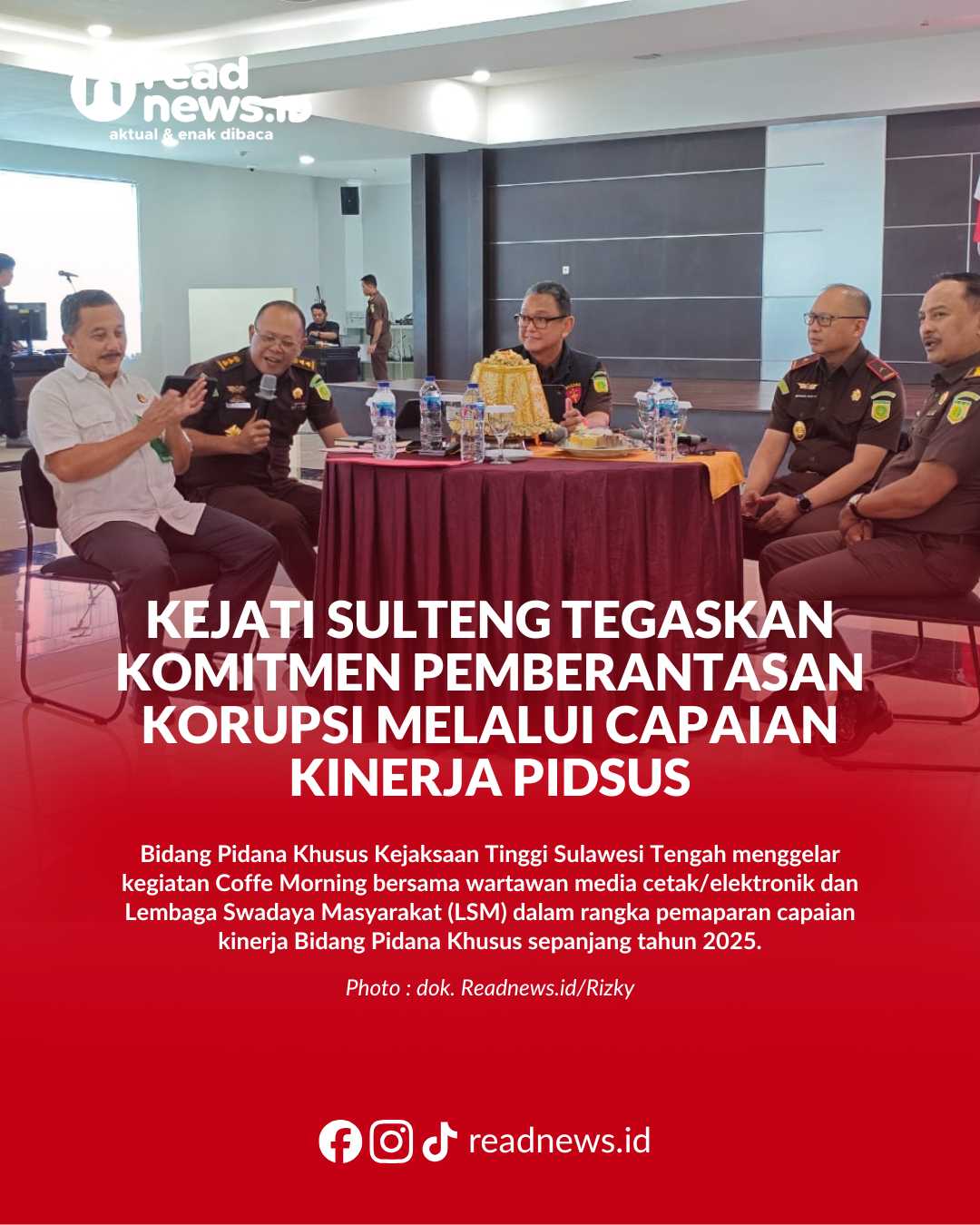 READNEWS.ID, PALU – Bidang Pidana Khusus Kejaksaan Tinggi Sulawesi Tengah menggelar kegiatan Coffe Morning bersama wartawan media cetak/elektronik dan Lembaga Swadaya Masyarakat (LSM) dalam rangka pemaparan capaian kinerja Bidang Pidana Khusus sepanjang tahun 2025.