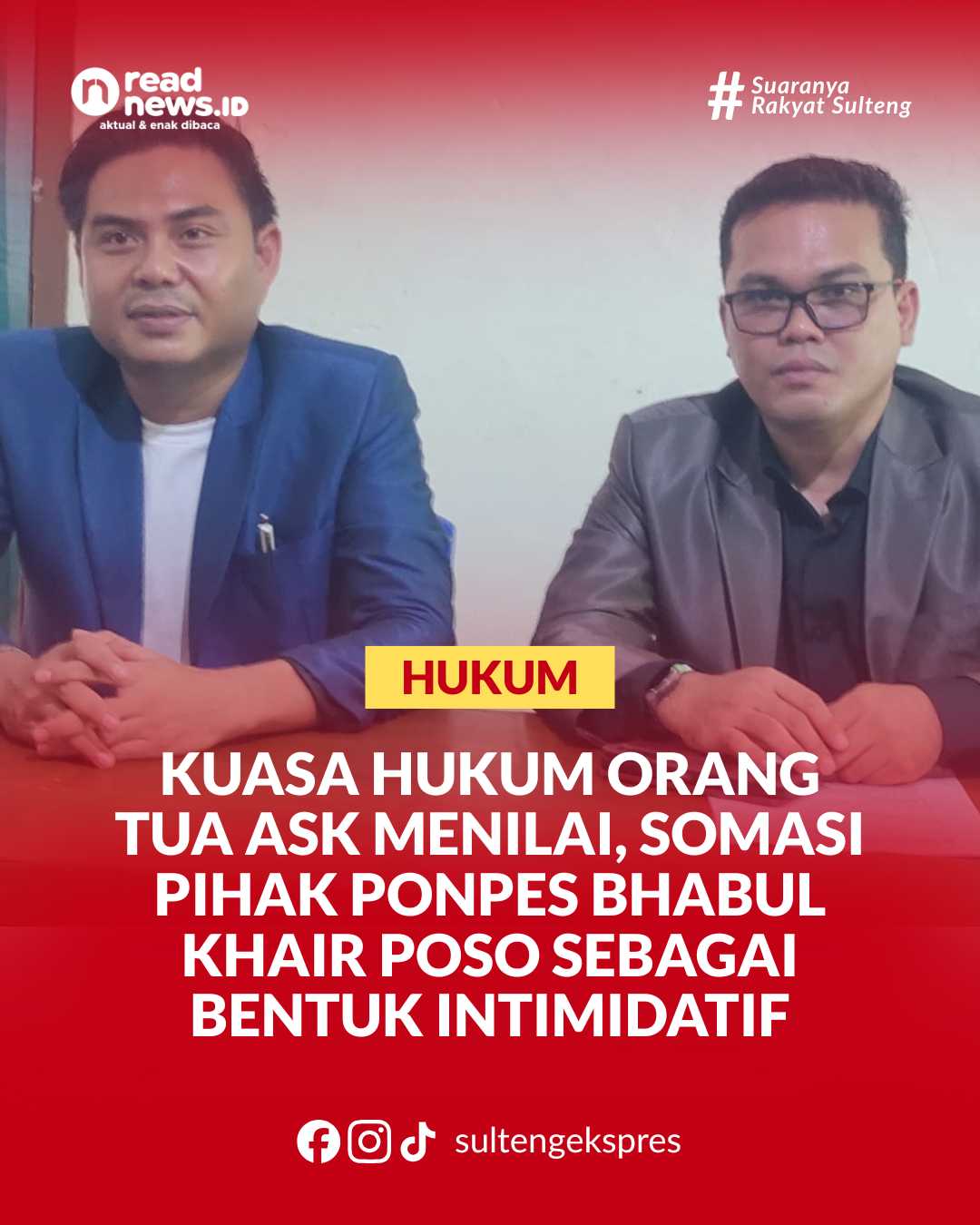 READNEWS.ID, POSO – Terkait somasi yang dilayangkan kepada orang tua ASK oleh pihak Pondok Pesantren (Ponpes) Babul Khair Poso, kuasa hukum orang tua ASK menilai langkah tersebut sebagai bentuk intimidasi hukum.