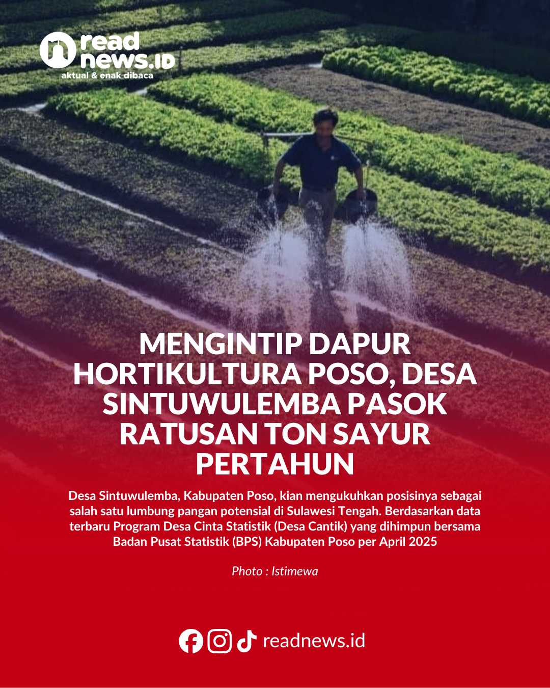 READNEWS.ID, POSO – Desa Sintuwulemba, Kabupaten Poso, kian mengukuhkan posisinya sebagai salah satu lumbung pangan potensial di Sulawesi Tengah. Berdasarkan data terbaru Program Desa Cinta Statistik (Desa Cantik) yang dihimpun bersama Badan Pusat Statistik (BPS) Kabupaten Poso per April 2025, desa ini mencatatkan angka produksi komoditas hortikultura yang signifikan, dengan kangkung dan terong sebagai komoditas unggulan.