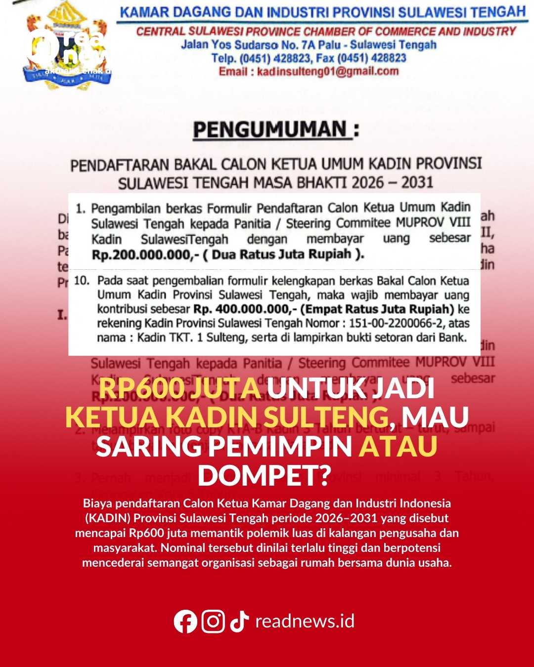 READNEWS.ID, PALU – Biaya pendaftaran Calon Ketua Kamar Dagang dan Industri Indonesia (KADIN) Provinsi Sulawesi Tengah periode 2026–2031 yang disebut mencapai Rp600 juta memantik polemik luas di kalangan pengusaha dan masyarakat. Nominal tersebut dinilai terlalu tinggi dan berpotensi mencederai semangat organisasi sebagai rumah bersama dunia usaha.