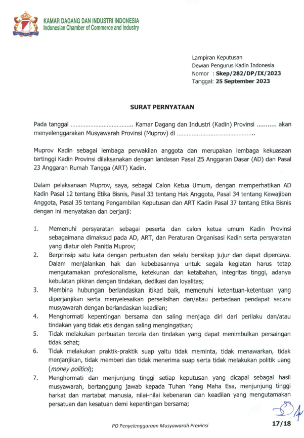 Di sisi lain, dalam surat pernyataan calon Ketua KADIN Sulteng, pada poin enam tertulis komitmen untuk tidak melakukan praktik suap maupun politik uang dalam bentuk apa pun.