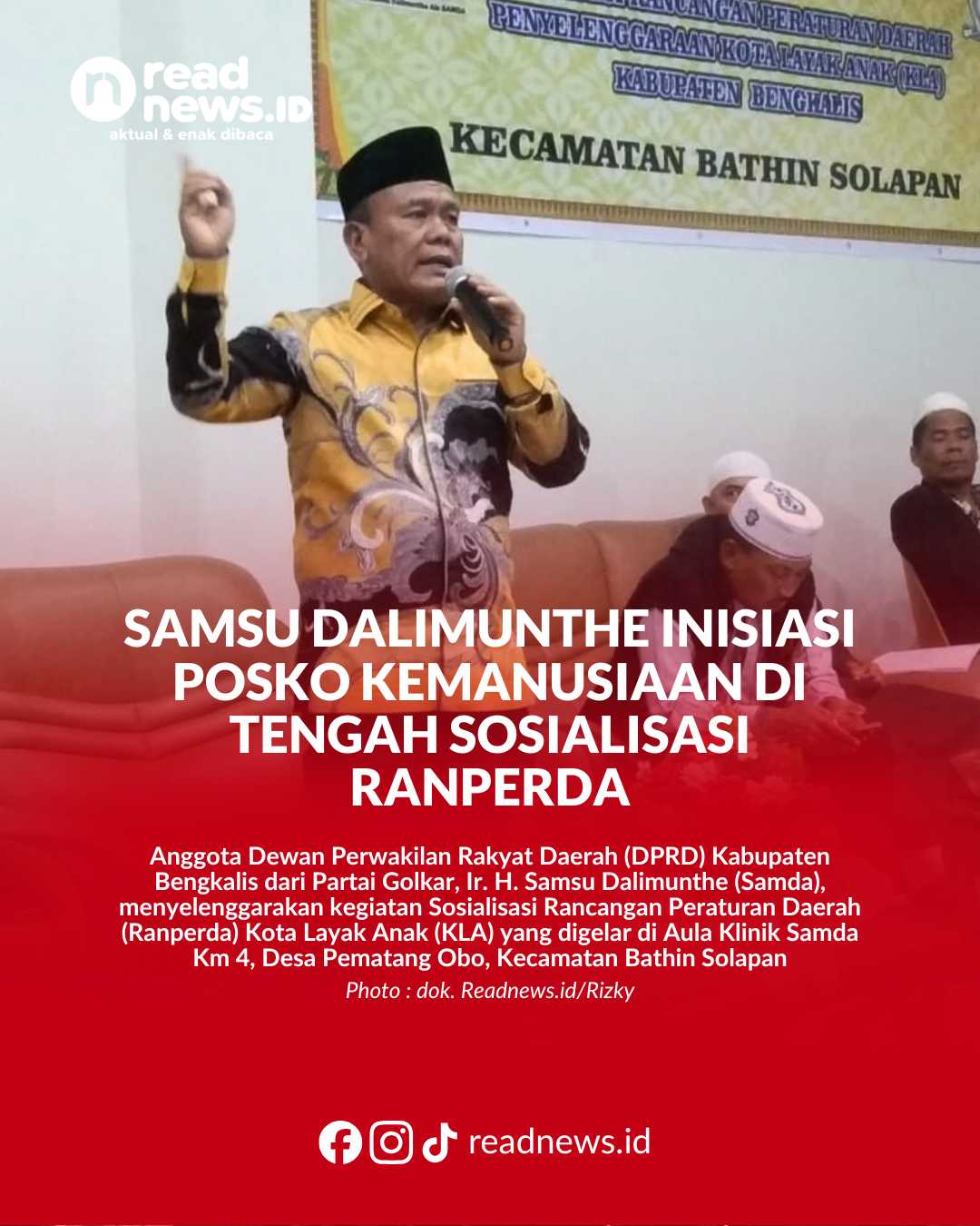 READNEWS.ID, BENGKALIS – Anggota Dewan Perwakilan Rakyat Daerah (DPRD) Kabupaten Bengkalis dari Partai Golkar, Ir. H. Samsu Dalimunthe (Samda), menyelenggarakan kegiatan Sosialisasi Rancangan Peraturan Daerah (Ranperda) Kota Layak Anak (KLA) yang digelar di Aula Klinik Samda, Km 4, Desa Pematang Obo, Kecamatan Bathin Solapan, Jumat malam (5/12).