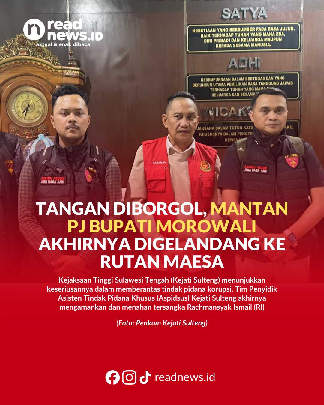 READNEWS.ID, PALU – Kejaksaan Tinggi Sulawesi Tengah (Kejati Sulteng) menunjukkan keseriusannya dalam memberantas tindak pidana korupsi. Tim Penyidik Asisten Tindak Pidana Khusus (Aspidsus) Kejati Sulteng akhirnya mengamankan dan menahan tersangka Rachmansyak Ismail (RI), yang diketahui merupakan mantan Penjabat Bupati Morowali sekaligus mantan Kepala Dinas ESDM Provinsi Sulawesi Tengah, dalam perkara dugaan Tindak Pidana Korupsi (TPK) Mess Pemda Kabupaten Morowali.